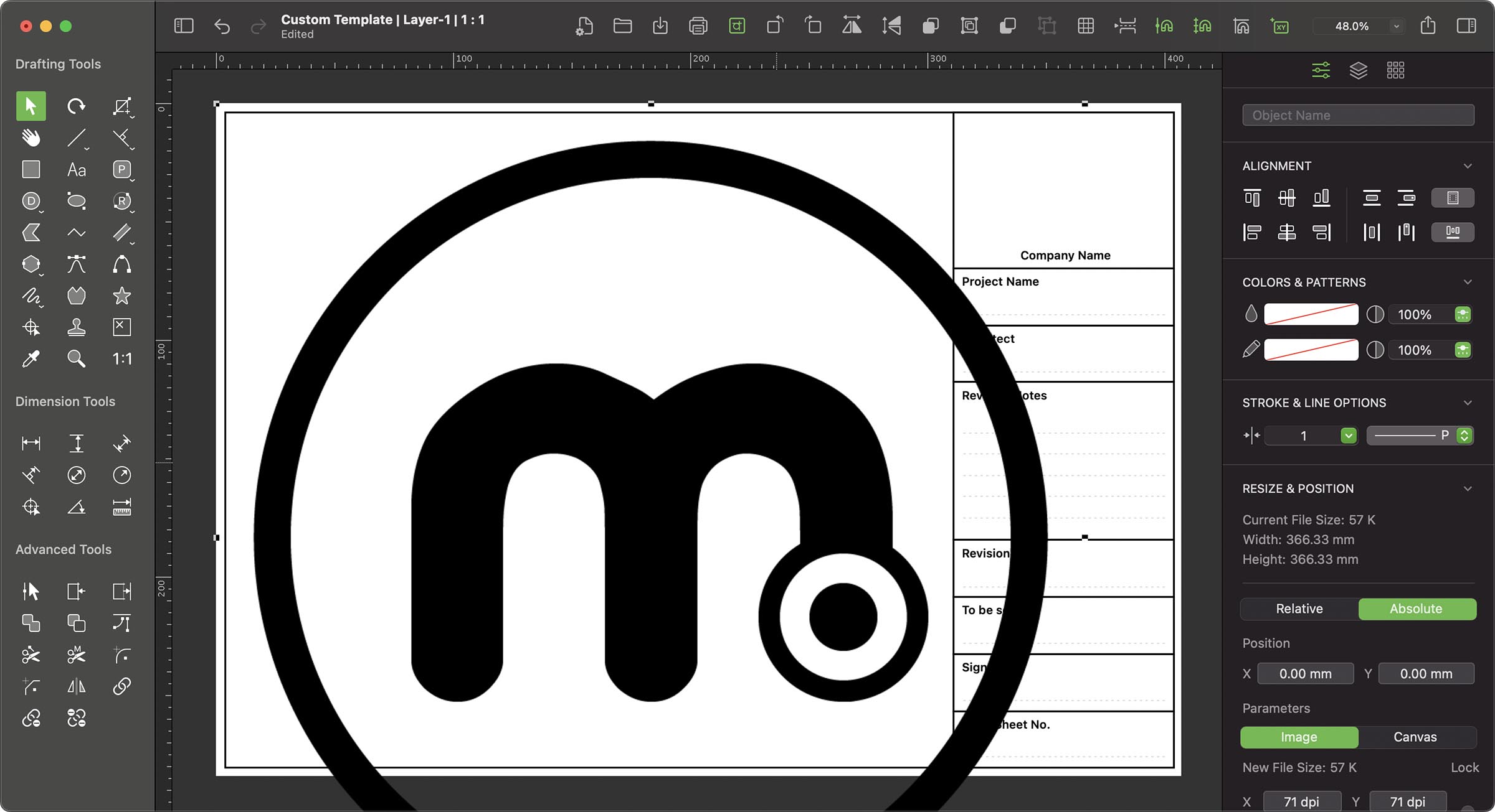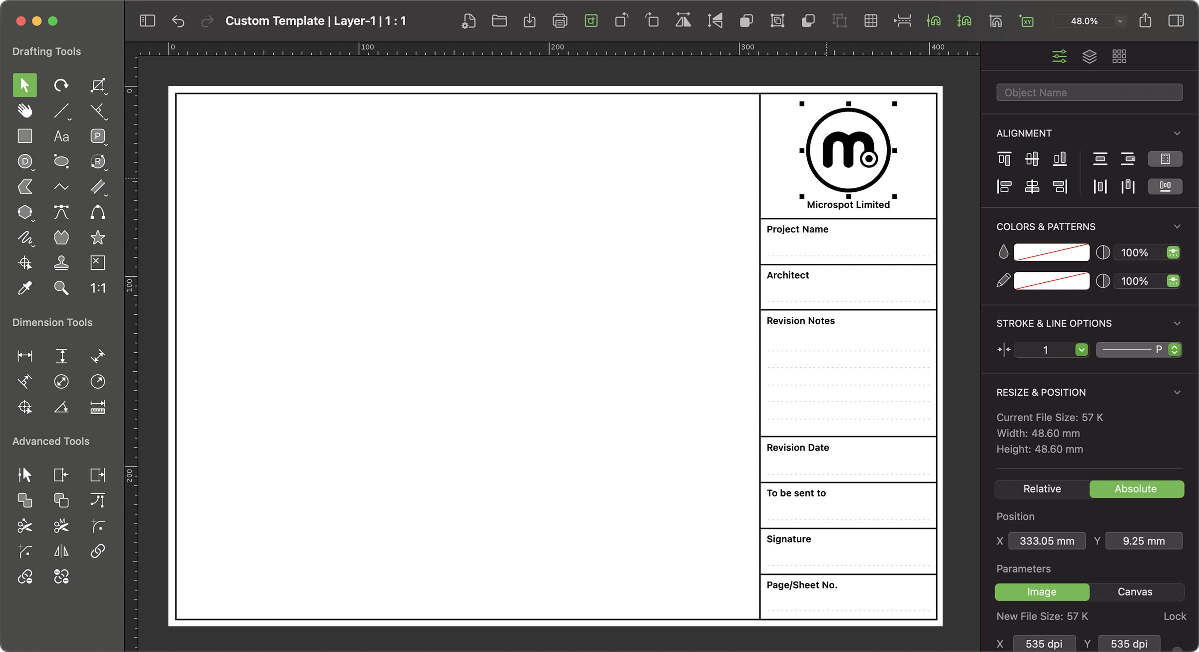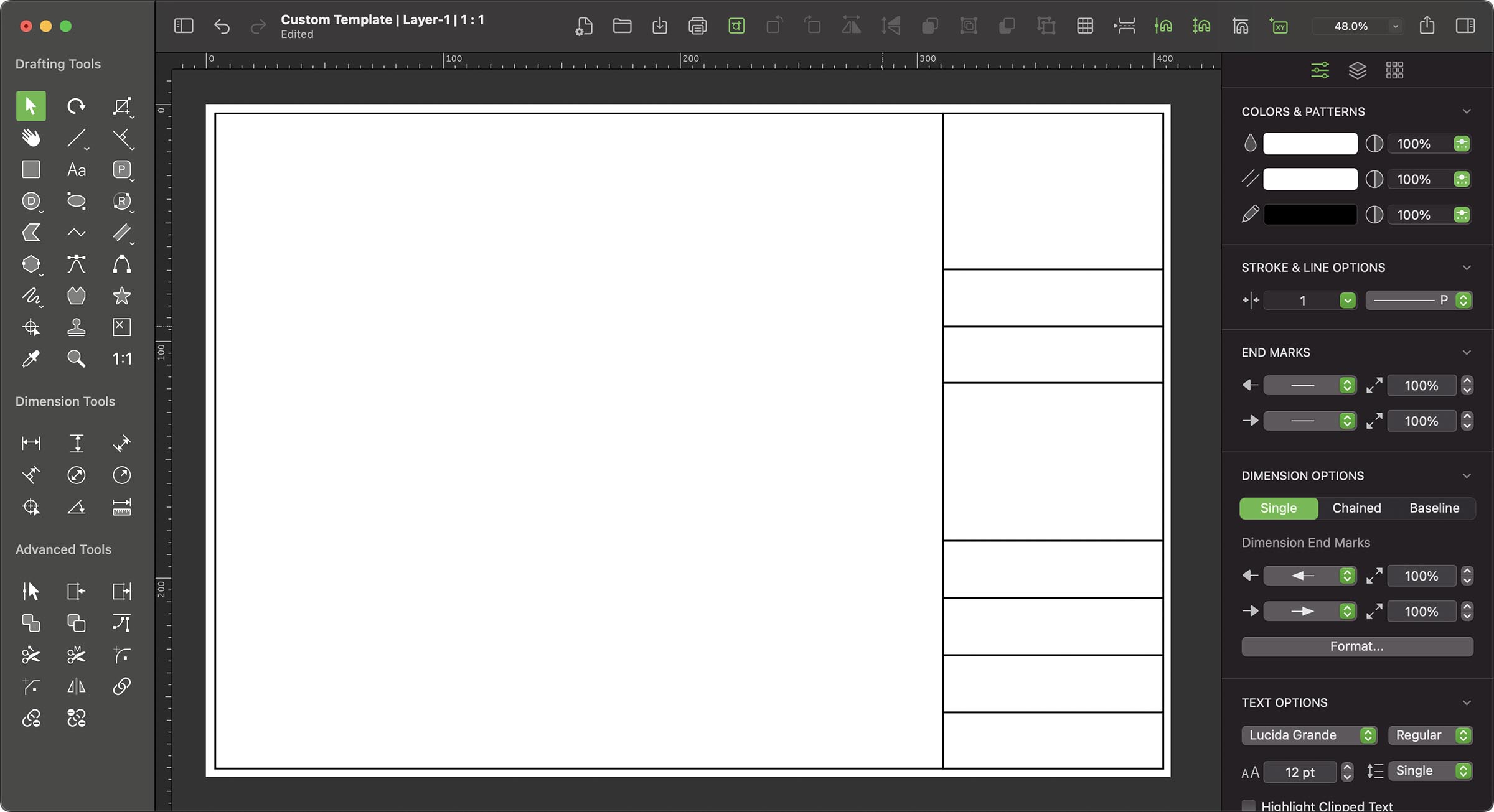 Templates are excellent for anyone who wants to use a particular style of page/sheet for many different drawings. For example, you can create a template with a frame that shows you company information, the job title, scale, page number, what ever you want and have this page open automatically whenever you launch MacDraft. Another amazing thing about templates is that any work you do will not save over the template file, it will create a new document meaning that your template will be ready to use for your next drawing too!