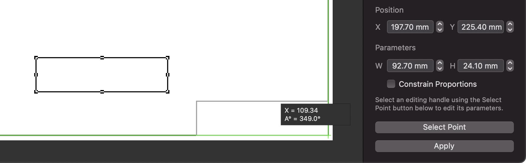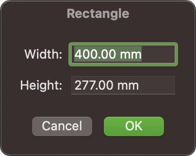 - Select the Rectangle tool from the Drafting Tools section on the left panel. Lets draw a rectangle 20mm smaller than the page size to 277 x 400 mm (Note: Depending on your printer margins, you may need to change the rectangle size to fit inside the page). With the rectangle tool selected, double click in the document and type in those dimensions.