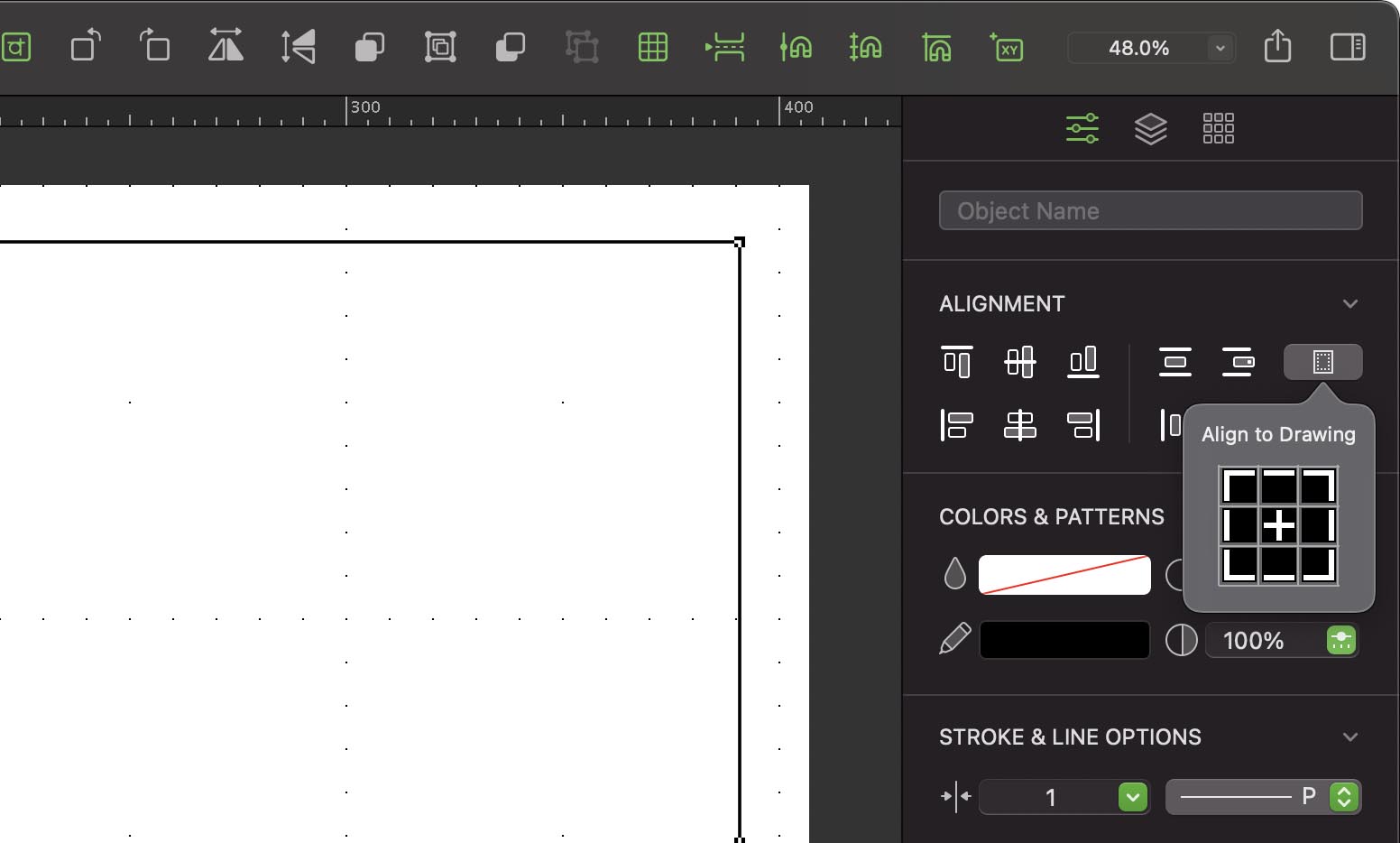 - The alignment options allow you to align objects to one another based on different edges and verticies. I addition you can also align to the document and that’s what we’ll be doing here. Click the To Document button in the Alignment section. Click on the + (plus) symbol in the To document section to align the rectangle to the centre of the page. We now have a rectangular frame equally positioned in the center of the document (depending on the rectagle size you used).