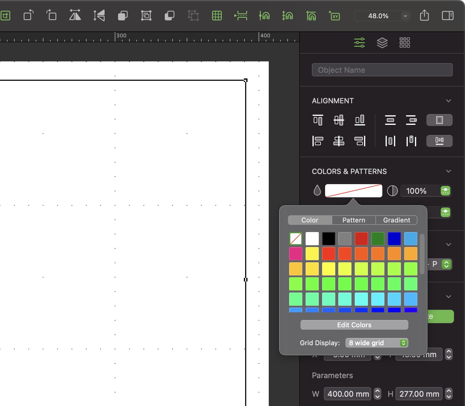- With the rectangle drawn we can now remove the fill color. Make sure the rectangle is selected and go to the Colors and Patterns