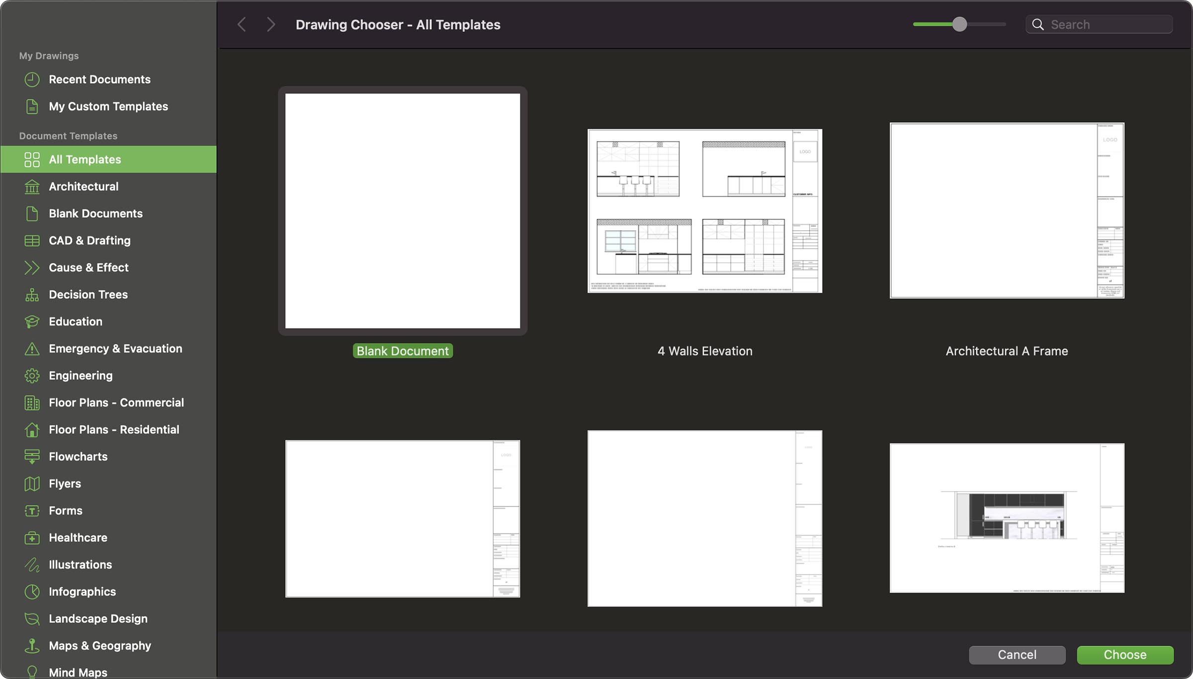 - Run MacDraft up and click Choose to start with a MacDraft template from the welcome screen. Then choose Blank Document from the template chooser window.