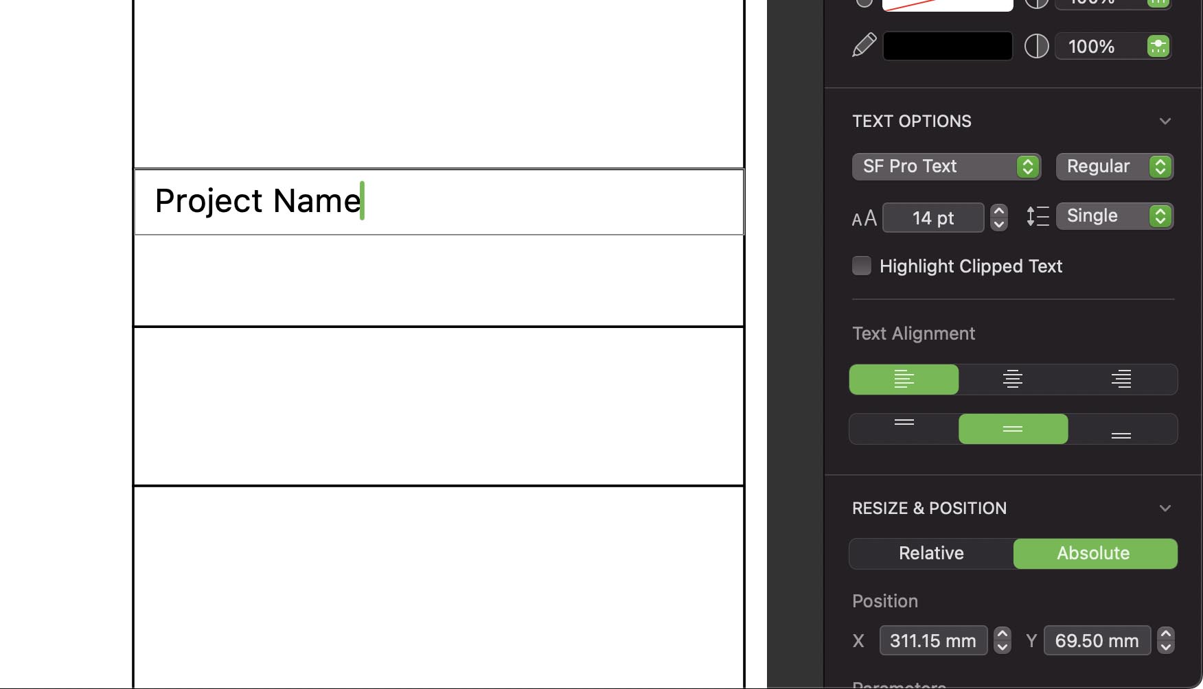- Enter the text you want. I have made the text box the same width as one of my title blocks to make positioning it easier and entered the text ‘Project Name’.