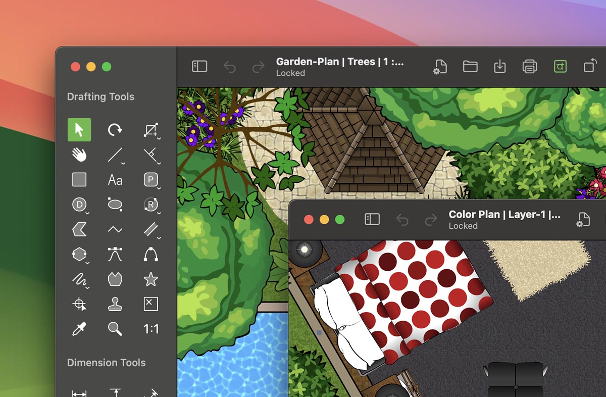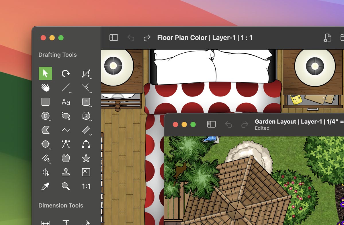 Professional 2D CAD software bundle on the Mac, designed for interior, garden, landscape and hospitality plans. Includes MacDraft Pro and over 1100 symbols.