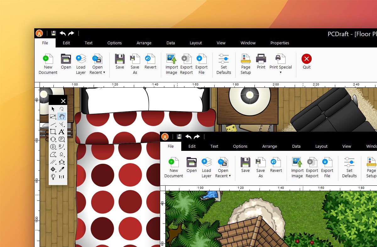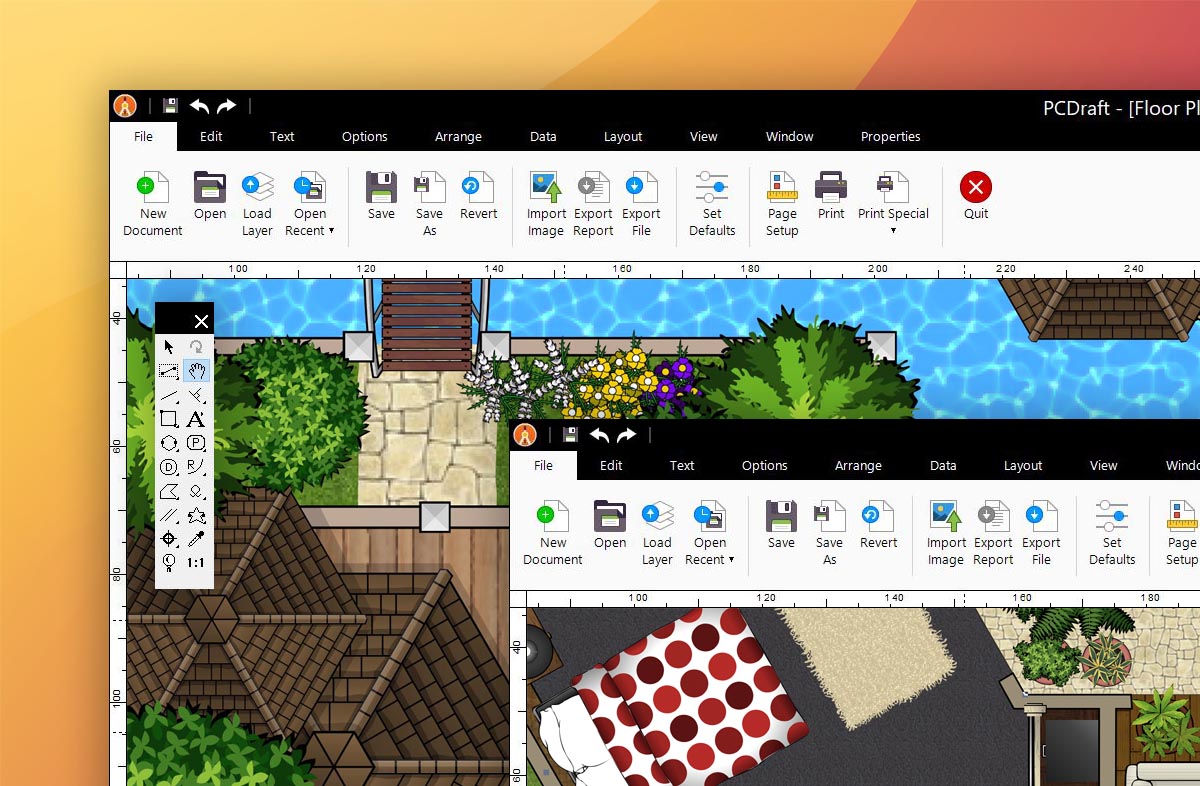Professional 2D CAD software bundle for PC, designed for interior, garden, landscape and hospitality plans. Includes PC Draft Pro and over 1100 symbols.