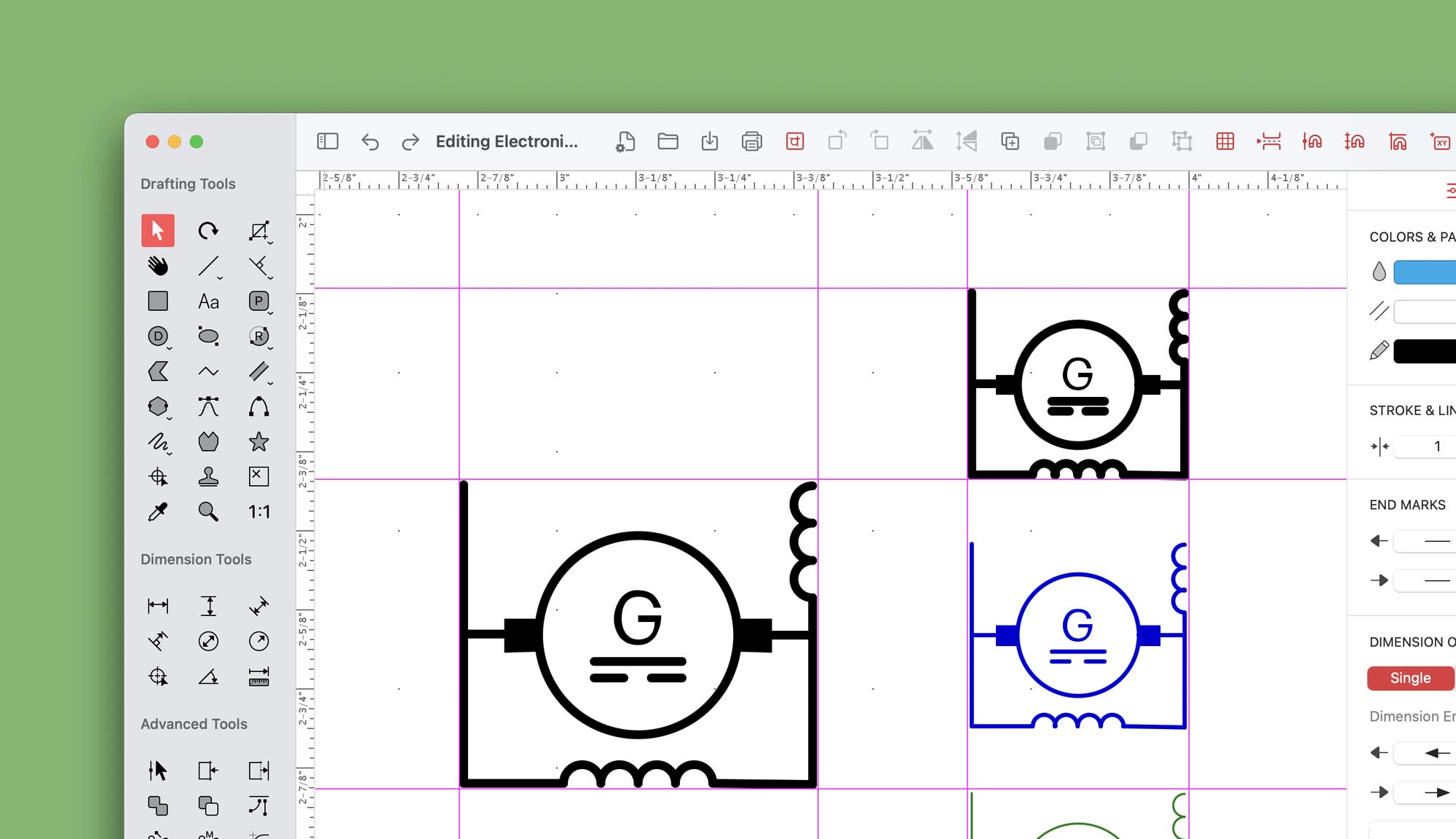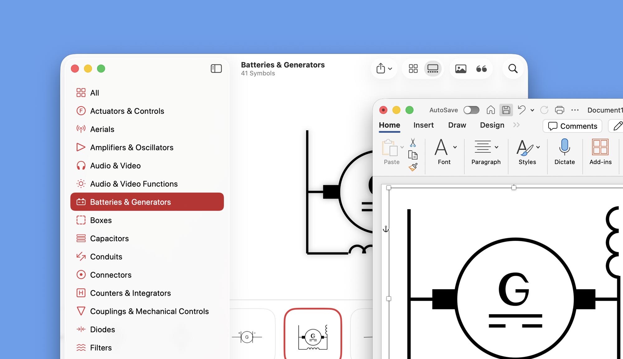Electronic Symbol Libraries is a catalog library that contains over 1200 professionally-drawn vector symbols for use in electronic schematics, circuit and wiring diagrams and technical layouts. Designed to integrate with almost all macOS applications. Symbols can dragged and dropped into your favourite and preferred documents, such as Word, Illustrator, Text Edit and more. Graphics can also be exported as scalable content and edited using MacDraft or other vector graphics tools, to create custom symbols that will include shared design styles, with your current projects. Whether it’s aerials, capacitors, diodes, fuses… and more, you'll find it all here!